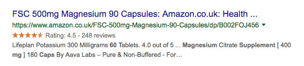 Boots, on the other hand, don’t have any additional information displayed. And, for this reason, a high proportion of users will choose the Amazon result. Obviously, these are quite big brands and so people might choose Amazon for brand loyalty, ease or whatever other reason. But the same could be said even if these were two no-name results given as example instead.